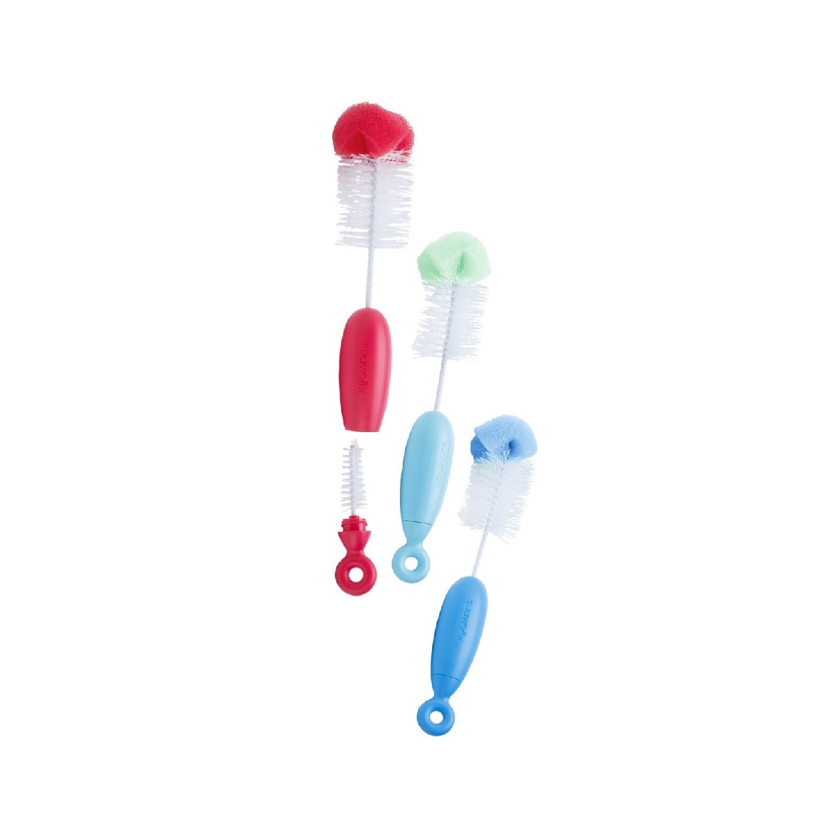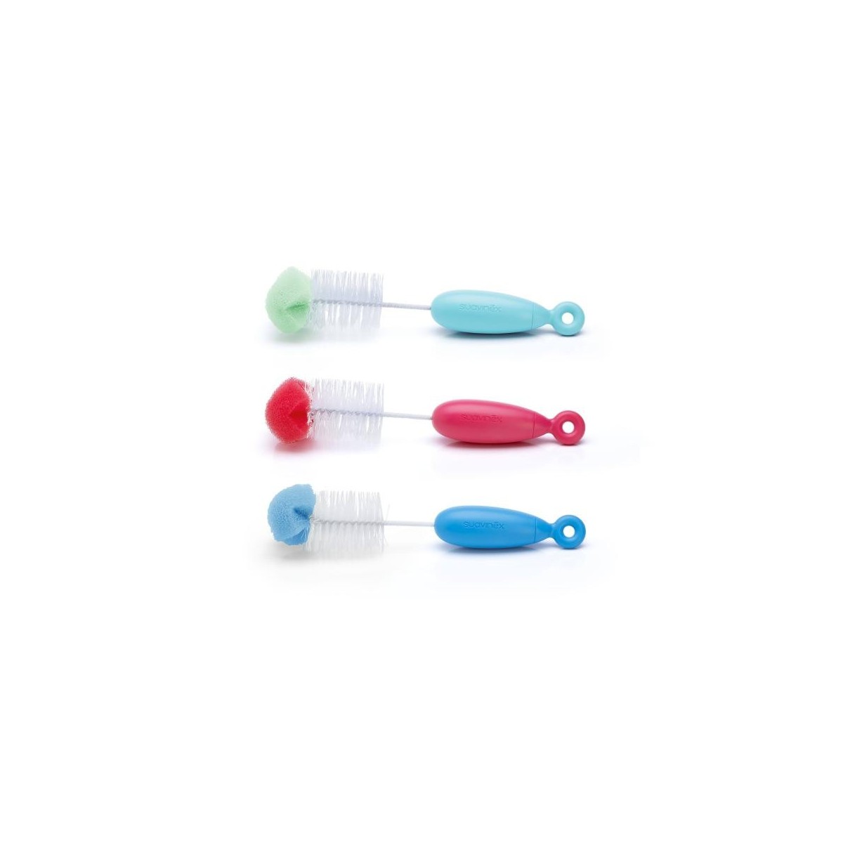 Cepillo limpiabiberón duo con cepillo para tetinas en el interior. Posee cerdas flexibles que no rayan y una esponja suave muy resistente.